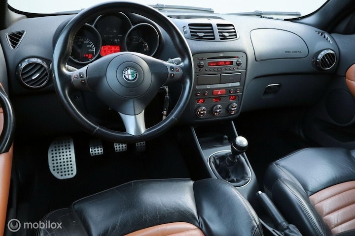 Een zuiver stukje Italiaanse huisvlijt, zo'n snerpende 3.2 Busso V6. Niet voor niets wordt-ie in Italië de viool van Arese genoemd: wat een heerlijke sound. De rij-eigenschappen met de handgeschakelde zesversnellingsbak zijn als een mes door de boter. Dankzij de 90 graden blokhoek heeft de motor veel koppel onderin: hij pakt gewoon zonder bokken op bij 50 km/u in zijn 6. Verpakt in de bekende 147 hatchback is het totaalplaatje een ontzettend leuke en originele hot hatch van Alfa Romeo. Dit betreft een Japanse importauto die dankzij het goede klimaat uitstekend geconserveerd is. Heel goede optische en technische staat en hij heeft slechts 116.000 kilometer (aantoonbaar) gereden. Qua uitrusting is voorzien in BOSE soundsystem, vol leder bicolore, stoelverwarming, climate control, xenon en 17 inch Teledial velgen. Nieuwe apk en onderhoudsbeurt bij aflevering.