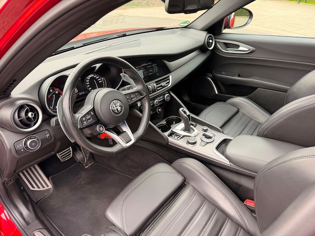 De luxe en comfort komen volop tot hun recht in deze Giulia, dankzij elektrische en verwarmbare sportstoelen met lederen bekleding, een verwarmd lederen sportstuur, adaptieve cruise control, full-map navigatie en een geavanceerd multimedia-systeem inclusief Apple CarPlay/Android Auto en DAB-radio. Regensensoren, een achteruitrijcamera en parkeersensoren voor en achter zorgen voor ultiem gemak tijdens het rijden en parkeren.