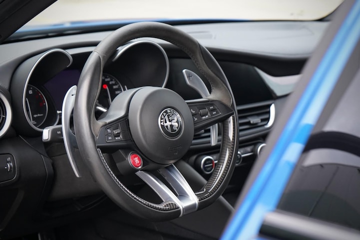 Een Giulia Quadrifoglio uit 2019, en wat voor één... Maar heel zelden komen ze voor in Blu Misano. En dan ook nog eens met maar 38.000km gereden en in waanzinnig mooie staat. Op en top verzorgd zowel van binnen als van buiten. Uitgerust met de mooie Classico velgen, rode remmen, het carbon leder alcantara stuurwiel en zwarte stiksels in het intererieur. Daarnaast ook nog voorzien van privacy glass en het brede 8,8 inch infotainment systeem. Volledig inzichtelijk onderhouden en zowel van binnen als van buiten als nieuw. Kijk voor meer dan 35 foto's in hoge resolutie op www.samvandalen.com