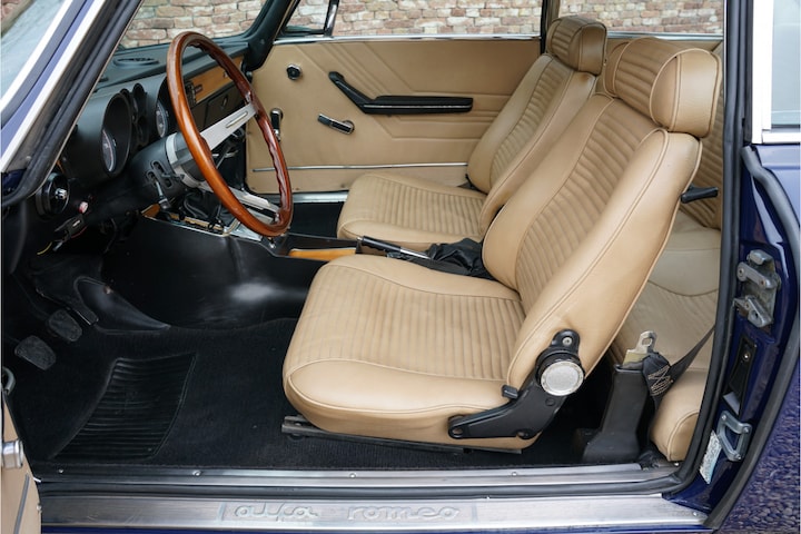 "Blu Ollandese", misschien wel de mooiste kleur voor een Alfa Romeo uit de 105-serie. In dit geval ook nog eens uitgerust met die overheerlijke 2000 motor met dubbele Weber carburateurs. Dit exemplaar werd voor het eerst toegelaten tot het verkeer in de Verenigde Staten in 1974. De auto is volledig gerestaureerd en verkeert in prachtige conditie. De carrosserie ziet er fantastisch uit en is vrij van gebruikerssporen. Het plaatwerk is mooi dun en de passingen zijn correct. De "Blu Ollandese" lak is zeer goed gespoten en ziet er prachtig uit. De chromen sierlijsten op de carrosserie verkeren eveneens in zeer goede staat. Het interieur is voorzien van zwarte tapijten en beige vinyl bekleding die prachtig past bij de auto. De 2000 GTV werd gedurende de restauratie opnieuw bekleed en de bekleding verkeert dan ook in top staat. Vanzelfsprekend ontbreken het typische houten stuurwiel en de lange pook niet. De ergonomie in deze Alfa Romeo is on-Italiaans goed. Zodra u plaatsneemt is het zeer eenvoudig om een fijne zitpositie te vinden. Het is dan ook niet verwonderlijk dat de 2000 GTV nog altijd zo'n geliefde klassieker is. Het is een heerlijke auto om een stevig potje mee te gaan sturen maar is evenwel prima in staat om in comfort lange afstanden af te leggen. Verder valt de verzorgde staat van het dashboard op. Alle instrumenten en bedieningselementen zijn perfect voor elkaar en functioneren zoals het hoort. De 2.0 liter viercilinder motor met dubbele bovenliggende nokkenassen levert 132 pk bij 5.500 toeren en is gekoppeld aan een handgeschakelde transmissie met vijf versnellingen. De motor maakt licht werk van de slechts 1.028 kilo wegende Italiaanse coupé. De auto staat op de iconische turbine wielen en is volledig "ready to go". De auto wordt geleverd inclusief kopie van het originele Alfa Romeo instructieboekje. Het enige dat u nog maar hoeft te doen is in te stappen en te genieten van deze fantastische Alfa Romeo 2000 GT Veloce.