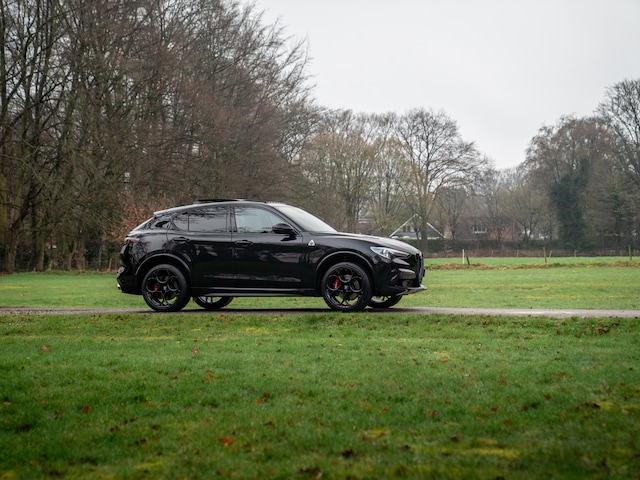 Heerlijke Stelvio Quadrifoglio in het Nero Vulcano met een Nero interieur, carbon interieurpakket, Harman/Kardon, panoramadak, Driver Assistance Pack 2 etc.
