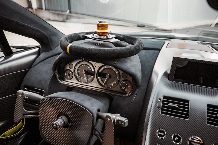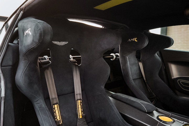 Het racethema gaat verder in het interieur, met uitgebreid gebruik van koolstofvezel, Dark Knight Alcantara-bekleding met limoengroene accenten en een aangepaste rolkooi ontworpen door Q by Aston Martin. Het resultaat is een Vantage die er net zo spectaculair uitziet als hij rijdt.