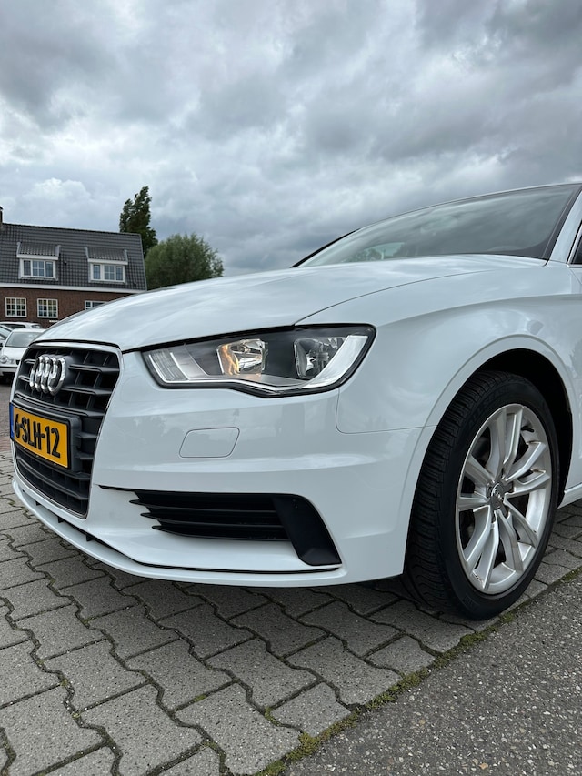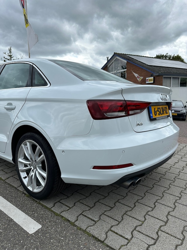Audi A3 Sedan met een automaat voorzien van parkeersensoren achter, navigatie met bluetooth, cruisecontrol, automatische verlichting, half lederen bekleding en lichtmetalen velgen.
