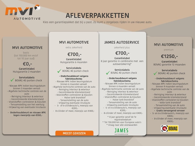 Dit afleverpakket bevat (in plaats van afleverpakket "Basis"): BOVAG 40-Puntencheck; Huisgarantie (6 maanden garantie); * 8 jaar garantie vanaf de 1e registratiedatum, * Tot 150.000 km voor Europese auto's, * Vraag naar alle voorwaarden, 5- en 6-cilinderauto's, meerprijs van €200,-, 8-cilinder of meer, meerprijs van €400,-, Algehele technische controle van de auto, APK indien keuringsdatum binnen 6 maanden vervalt, Gecontroleerde kilomterstand, Halve tank brandstof, Onderhoudsbeurt volgens fabrieksschema, Reiniging interieur & exterieur, Tenaamstelling van de auto, Vloeistoffen controleren & bijvullen, Vrijwaring eventuele inruilauto
