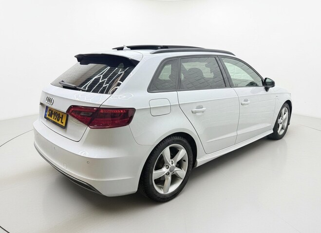 De Audi A3 Sportback vertegenwoordigt het beste van degelijk Duits design. S-Line styling benadrukt de sportieve functionaliteit van het ontwerp. De uitstekende prestaties van deze auto komen van de viercilinder motor en de automatische transmissie. Het stijlvolle lederen interieur geeft deze Audi A3 Sportback net dat beetje extra. Op koude en donkere dagen zijn de verwarmbare voorstoelen een uitkomst. De sportstoelen zorgen voor een strak uiterlijk én een uitstekende zitsteun. Het daglicht valt in overvloed via het elektrisch bediende panoramadak op het fraaie interieur. De gasontladingslampen van de xenonverlichting zorgen voor een krachtige en heldere lichtbundel. Bij de uitrusting van deze Audi horen onder meer 18 inch lichtmetalen velgen, sportonderstel, halflederen bekleding, warmtewerend glas, dakspoiler en elektrisch inklapbare buitenspiegels.
