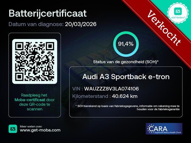 We mogen weer een onwijs leuke Audi A3 Sportback 40 e-tron aan de collectie toevoegen. Uitgevoerd in ‘Gletsjerwit’ en gecombineerd met een zwart stof/lederen interieur. Deze Audi is voorzien van de belangrijkste opties zoals: 17 inch lichtmetalen velgen, Virtual Cockpit, Navigatiesysteem, Parkeersensoren, Stoelverwarming, LED koplampen, Cruise Control en ga zo maar door. Keurig onderhouden, afkomstig van de tweede eigenaar, de SOH bedraagt 91% en helemaal klaar voor de volgende liefhebber dan wel liefhebster. Graag tot snel in Harderwijk!
