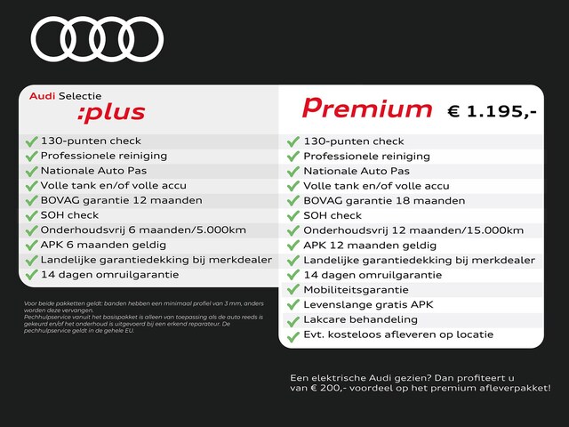 - Audi Selectie :plus (inbegrepen): Dit afleverpakket bevat: BOVAG garantie (12 maanden); 14 dagen omruilgarantie (max 500 km), APK 6 maanden geldig, Bovag 40 punten check, Landelijke garantiedekking bij merkdealer, Nationale Auto Pas check, Onderhoudsvrij 6 maanden/5.000km, Professionele reiniging, SOH check (Plug-in Hybride & EV), Volle tank en/of volle accu