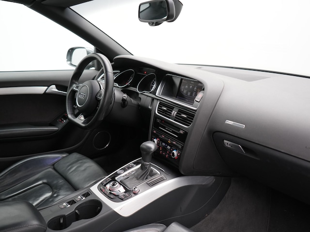 Ook de akoestiek in de auto wordt optimaal benut door het high performance audiosysteem. Bij de luxe van deze auto hoort ook automatische airconditioning. Parkeerplekken worden er niet ruimer op. Maar met de aanwezige parkeersensoren krijgt u deze Audi A5 Cabriolet zonder problemen op z'n plaats. De auto neemt u werk uit handen doordat hij zelf veel in de gaten houdt. Een regensensor en een automatisch inschakelbare verlichting nemen waar wanneer de ruitenwissers en het licht aan moeten. De cruise control zorgt voor een prettige, gelijkmatige koers en minder brandstofgebruik. Ook navigatiesysteem met harde schijf, DAB ontvangst, sportstuurwiel, centrale deurvergrendeling met afstandsbediening en boordcomputer horen tot de voorzieningen op deze auto.
