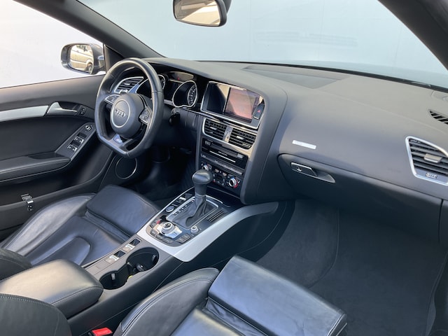 Wat wilt u onderweg horen? Er is volop keus, dankzij bluetooth. Het navigatiesysteem is met het audio-installatiesysteem gecombineerd. Automatische airconditioning regelt volautomatisch de temperatuur. U kiest de gewenste temperatuur en het systeem doet de rest. U kunt bij het inparkeren natuurlijk niet aan alle kanten ogen hebben. Daarom is deze Audi A5 Cabriolet voorzien van parkeersensoren! Om de veiligheid onderweg te verhogen, heeft deze Audi zowel een automatisch inschakelbare verlichting als een regensensor aan boord, zodat hij zelf de verlichting en de ruitenwissers kan inschakelen. Met de cruise control komt u bijna nog fitter aan dan u vertrekt. Extra opties op deze auto zijn: lederen stuur, centrale deurvergrendeling met afstandsbediening en boordcomputer.