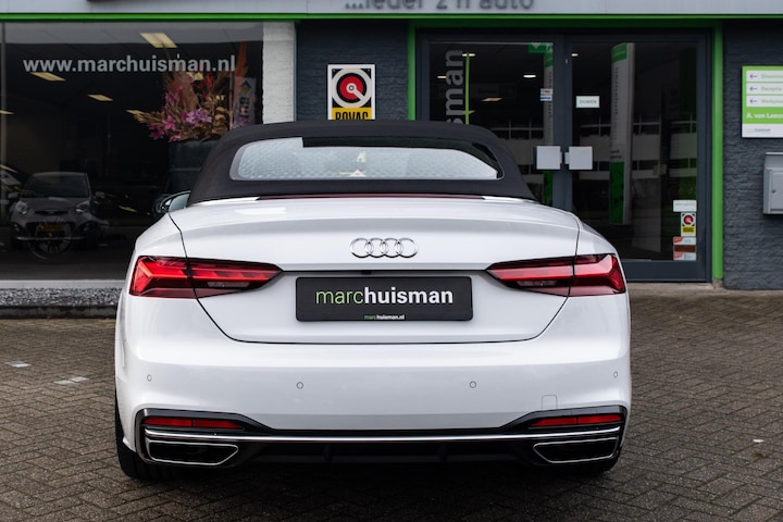 Zeer compleet uitgevoerde Audi A5 Cabriolet in Gletsjerwit metallic i.c.m. zwart lederen bekleding met stoelverwarming en nekverwarming. Zeer goed bijgehouden (volledig Audi dealer onderhouden). Uitgerust met o.a. 20 inch licht metalen velgen, matrix LED koplampen, achteruitrijcamera en MMI Plus navigatiesysteem met touchscreen! Zeer fraai uitgevoerd met de juiste looks. Voorzien van veel fabrieksopties zoals: