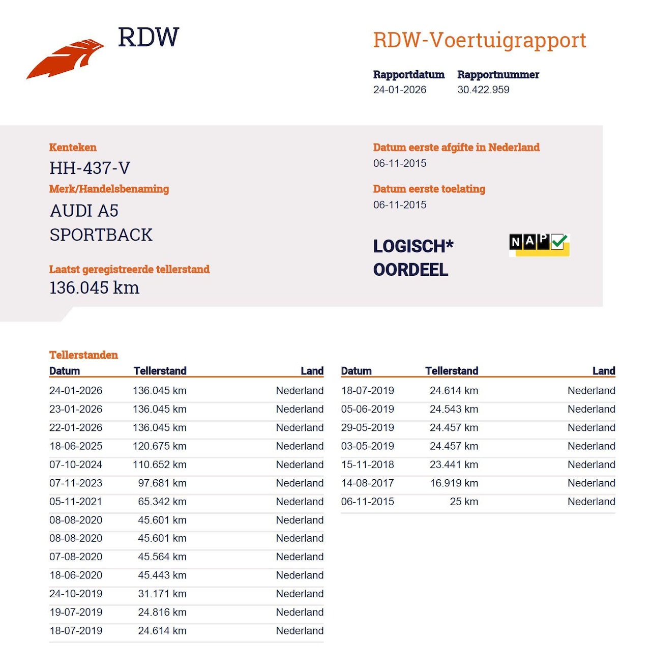 | Kilometerstand | 136.045 km |