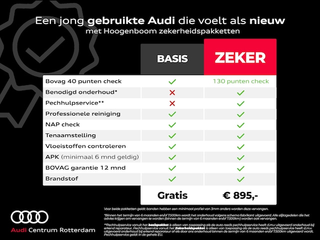 - Hoogenboom Audi Premium (€ 1.195 meerprijs): Dit afleverpakket bevat (in plaats van afleverpakket "Audi Selectie :plus"): Bovag garantie 18 maanden (18 maanden garantie); 14 dagen omruilgarantie (max 500 km), 130-punten check, APK 12 maanden geldig, Lakcare behandeling, Landelijke garantiedekking bij merkdealer, Levenslange gratis APK* (i.c.m. onderhoud volgens schema fabrikant bij Hoogenboom), Mobiliteitsgarantie, Mogelijkheid tot kosteloos afleveren op locatie, Nationale Auto Pas check, Onderhoudsvrij 12 maanden/15.000km, Professionele reiniging, SOH check (Plug-in Hybride & EV), Volle tank en/of volle accu