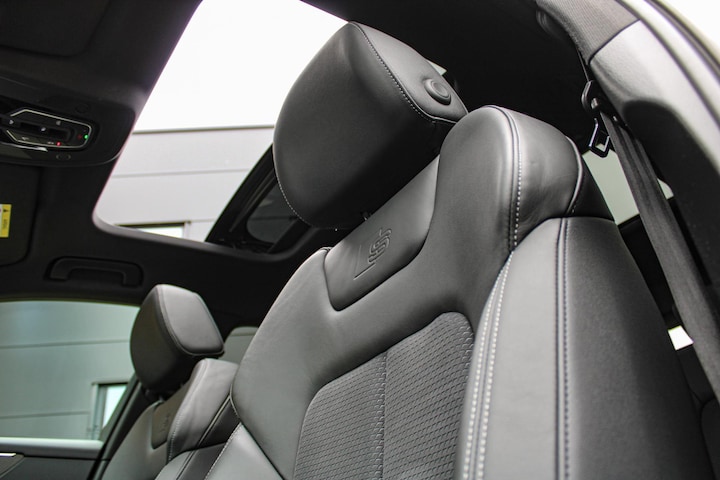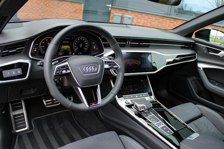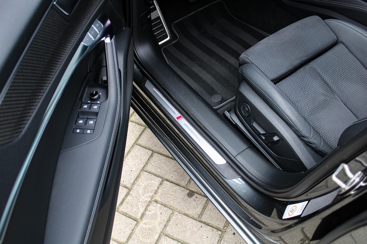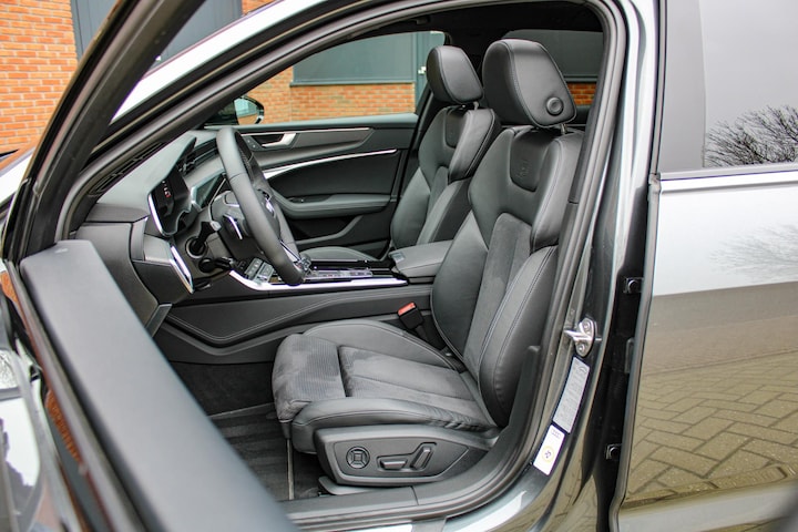 Deze A6 is rijk uitgerust met onder meer lederen/alcantara sportstoelen met contrasterend stiksel, geheugenfunctie en stoelverwarming, een glazen panoramadak met schuif-/kantelfunctie, verwarmd stuurwiel, Top View 360°-camera, 30-kleuren ambianceverlichting, keyless entry, standkachel, adaptieve cruise control, lane assist en carbon interieurlijsten.