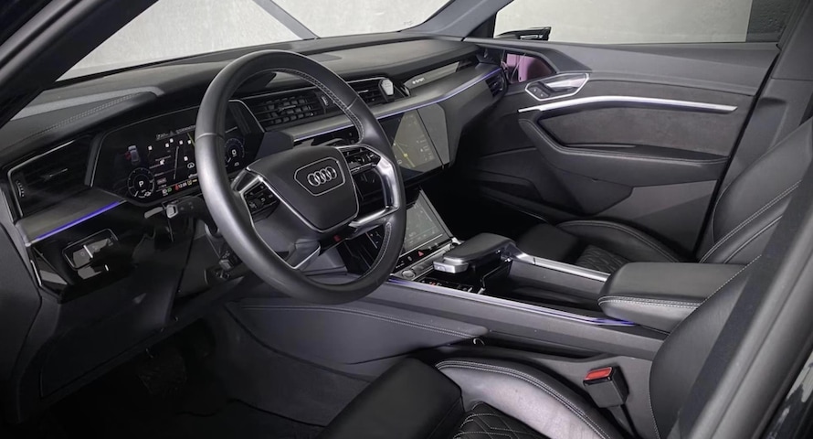 Audi E-tron 55 Quattro Sportback S-Line. Alle accenten van deze Audi zijn Black Optiek (hoogglans zwart) en het interieur is schitterend uitgevoerd met Diamond Sticksel / ruitjesleder.