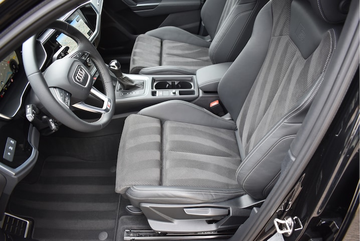 Model 2022 Audi Q3 Sportback 45 Tfsi e 245 Pk S-Line 09-2022 met slechts 38 Dkm Mythos Zwart Metallic DLR Onderhouden Opties: Matrix Koplampen Leder/Alcantara Sportstoelen Black Optik Pakket Navigatie MMI Plus Virtual Cockpit Groot Achteruitrijcamera Climate Control 2 Zone Stoelverwarming Drive Select Instelbaar Sportstuur Parkeersensoren V+A ACC Adaptieve Cruise Control Lane Assistent Apple Carplay Ambiance Verlichting Dodehoek Detectie Getint Glas DAB Radio Zwarte Hemel S-Line Pakket 20 Inch Audi Sport Velgen