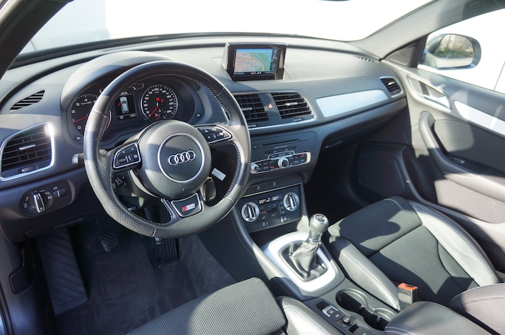 Prachtige Audi Q3 in de juiste kleurstelling, "Daytonagrau" metallic met zwart 1/2 lederen sportstoelen. Deze S-Line Q3 is voorzien van onder andere: Zwarte hemel, 18"lichtmetalen velgen, Full map navigatie, Lederen multi-stuurwiel, Xenon en Led verlichting, Parkeersensoren, Elektrisch wegklapbare trekhaak, Cruise control, etc. etc.