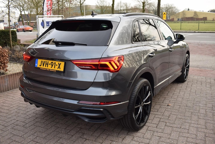 Uitmuntende prestaties, dynamische rijeigenschappen en bakken vol met rijplezier, deze Audi Q3 45 TFSI e S edition levert het allemaal. Het S-Line styling pakket maakt direct duidelijk waar deze Audi voor staat: onversneden sportiviteit en rijdynamiek. De aandrijving van deze Audi wordt verzorgd door een viercilinder motor en een automatische transmissie. Even een paar wel héél aantrekkelijke pluspunten van deze fraaie auto: een elektrisch bediend glazen panorama dak, een elektrisch bedienbare achterklep en een prachtig lederen interieur! Voorin is het 's winters genieten met de verwarmbare voorstoelen voor zowel bestuurder als bijrijder. Pittig rijden wordt nog comfortabeler dankzij de fraaie sportstoelen. Met de krachtige xenonverlichting heeft u optimaal zicht in het donker. Bij de zeer complete uitrusting van deze auto behoren ook elektrisch bedienbaar zonnescherm, warmtewerend glas, elektrische handrem, zwarte hemelbekleding, in delen neerklapbare achterbank en LED-achterlichten.
