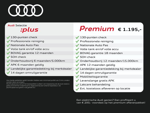 - Audi Selectie :plus (inbegrepen): Dit afleverpakket bevat: BOVAG garantie (12 maanden); 14 dagen omruilgarantie (max 500 km), APK 6 maanden geldig, Bovag 40 punten check, Landelijke garantiedekking bij merkdealer, Nationale Auto Pas check, Onderhoudsvrij 6 maanden/5.000km, Professionele reiniging, SOH check (Plug-in Hybride & EV), Volle tank en/of volle accu