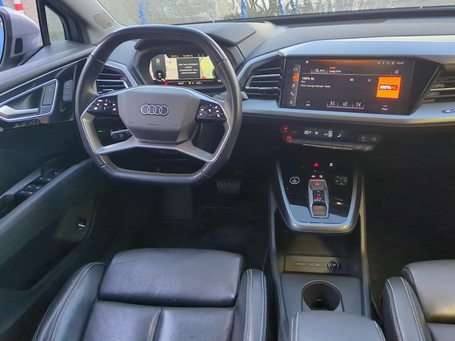 Milieubewust rijden en elke kilometer genieten. Het kan met deze elektrische Audi Q4 e-tron. Het aantal kilometers dat je op een acculading kunt rijden, is ruimschoots genoeg voor de gangbare dagelijkse ritten, en het opladen kan in de meeste gevallen 's nachts gebeuren. Een krachtige motor geeft deze auto zijn sportieve prestaties. 's Winters komen de verwarmbare voorstoelen heerlijk van pas. Goeie looks? Jazeker! Maar de sportstoelen zorgen ook voor een goed gesteunde en comfortabele zit. De bagageruimte is toegankelijk via een comfortverhogende elektrische achterklep. De slimme koplampen gebruiken de allernieuwste matrix LED-verlichting. Altijd maximaal zicht, nooit verblinding bij de tegenligger. Bij de uitrusting van deze Audi horen onder meer 19 inch lichtmetalen velgen, neerklapbare achterbank, LED-achterlichten en verstelbare lendensteunen.