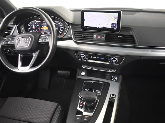 Kwaliteit komt nooit tekort in Duits vakmanschap, dat is te zien aan deze Audi Q5 met zijn stijlvolle ontwerp en comfortabele interieur. Mag het een beetje exclusief en sportief? Mooi, want deze is uitgevoerd met S-Line styling. De krachtige hybridemotor van deze auto is gekoppeld aan een automatische transmissie. Inladen is een eitje met de elektrisch bedienbare achterklep. En voor een frisse wind tijdens de rit is er het elektrisch bediende glazen panorama dak. Goeie looks? Jazeker! Maar de sportstoelen zorgen ook voor een goed gesteunde en comfortabele zit. Deze Audi Q5 is voorzien van luchtvering, en dat is te merken aan de rimpelloze wegligging. Bij de zeer complete uitrusting van deze auto behoren ook 19 inch lichtmetalen velgen, LED koplampen, halflederen bekleding, warmtewerend glas, in delen neerklapbare achterbank en LED-achterlichten. Ervaar de wonderen van de digitale mobiliteitswereld waarbij alles wat u wenst op het digitale dashboard verschijnt. Strak inparkeren wordt een fluitje van een cent door de achteruitrijcamera. Met adaptive cruise control houdt de auto zelfstandig afstand tot uw voorligger. Een veiligheidsverhogende optie waarmee u comfortabel onderweg bent. Na een lange werkdag in de file: daar zit niemand op te wachten. Gelukkig helpt de file assistent een handje. Het radarsysteem meet de ruimte tot de voorligger en bewaakt de juiste afstand. Stilstaan? Dan remt en stopt de auto vanzelf. Spraaksturing luistert naar uw stem en bedient de belangrijkste voertuigfuncties. Ook is de Audi uitgerust met: inklapbare trekhaak, connected drive services, full map navigatiesysteem, achteropkomend verkeer waarschuwing, automatische airconditioning en sportstuur met schakelpaddels. Zoals u mag verwachten van deze Audi Q5 is hij uitgerust met een reeks aan actieve veiligheidssystemen. Bij de veiligheidssystemen van deze auto hoort ook de verkeersbord-detectie. Die leest tijdens het rijden als het ware met u mee en attendeert u op de significante verkeersborden langs en boven de weg. Onbedoeld buiten de rijstrook raken wordt voorkomen door het Lane-keeping systeem. Forward collision warning helpt u om kop-staart aanrijdingen te voorkomen. De veiligheid van deze auto wordt verder verhoogd door dodehoekdetectie, hill hold functie, brake assist en bandenspanningcontrolesysteem. Maak nu een afspraak voor een proefrit!