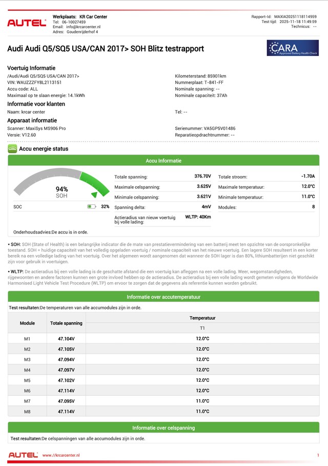 Een recent SOH testrapport uitdraai 18-11-2025 zit bij de auto, accu conditie is 94% en helemaal in orde! (zie laatste foto's)