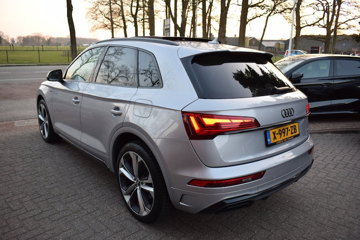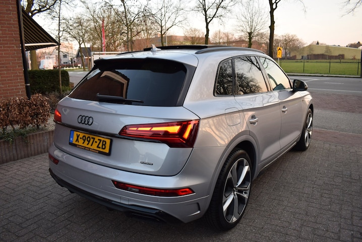 Auto's als deze Audi Q5 55 TFSI e S edition S-LINE bieden tegelijk rijdynamiek, comfort en degelijkheid. Houdt u van een sportieve, dynamische uitstraling? Dan komt de S-Line styling als geroepen. De krachtige motor geeft deze Audi uitstekende prestaties. Superieur rijgedrag onder moeilijke omstandigheden? Laat dat maar aan de vierwielaandrijving over! Deze Audi Q5 55 TFSI e S edition S-LINE is luxe afgewerkt. Kijk maar naar het lederen interieur! Op koude en donkere dagen zijn de verwarmbare voorstoelen een uitkomst. Zijwaartse g-krachten worden solide opgevangen door de sportstoelen. Licht en lucht komen onbelemmerd binnen als het elektrisch bediende glazen panoramadak met één druk op de knop wordt geopend. De elektrische achterklep opent met een druk op de knop, zodat u gemakkelijk toegang heeft tot de bagageruimte. Bij de zeer complete uitrusting van deze auto behoren ook verwarmd stuurwiel, 21 inch lichtmetalen velgen, bi-xenon koplampen, warmtewerend glas, elektrische handrem en zwarte hemelbekleding.