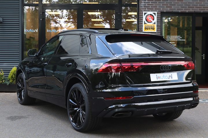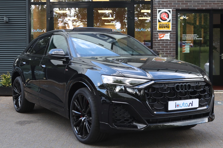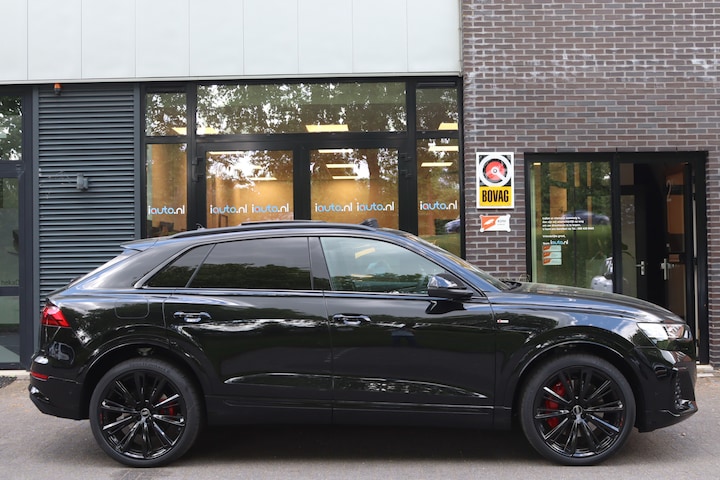 Direct uit voorraad leverbaar. Zeer luxe en sportieve Audi Q8 55 TFSI e Pro Line S. Voorzien van zeer veel opties, onder andere: Panoramadak, 23" Audi Sport lichtmetalen velgen, Laser-Matrix LED verlichting, Assistentie pakket City, Assistentie pakket Parking met 360 graden camera, Bang & Olufsen 3D audio system, Trekhaak elektrisch wegklapbaar, elektrische achterklep met voetbediening, Memorypakket op bestuurdersstoel, Uitgebreid Zwart Optiek pakket, Remzadels Rood gespoten, Keyless entry/start, 4-wiel besturing, Valcona lederen sportstoelen, stoelverwarming, stuurverwarming, luchtvering, Head-up display, stuurkolom elektrisch verstelbaar, Servosluiting voor Portieren, MMI Navigatie Plus, adaptieve cruise control, dodehoek detector en App-Connect (Apple CarPlay/Android). Deze Q8 wordt geleverd inclusief de originele verlengde fabrieksgarantie voor 3 jaar of maximaal 90.000 kilometer.