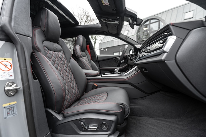 Een uitgebreide beschrijving vindt u op www.akker.nl. Deze Audi Q8 Hybride heeft een verlengde fabrieksgarantie tot 12-02-2031 (100.000 km). De nieuwprijs bedraagt €184.419,- Valcona lederen bekleding in geruit-design met rode stiksels (Audi Sport), Uitgebreid lederpakket (o.a. dashboard en portierarmsteunen), Assistentiepakket Parking met remote parkeerassistent plus, Onderstelpakket Advanced, Carbon Styling Pakket, Audi Exclusive Lak (Nardogrijs).