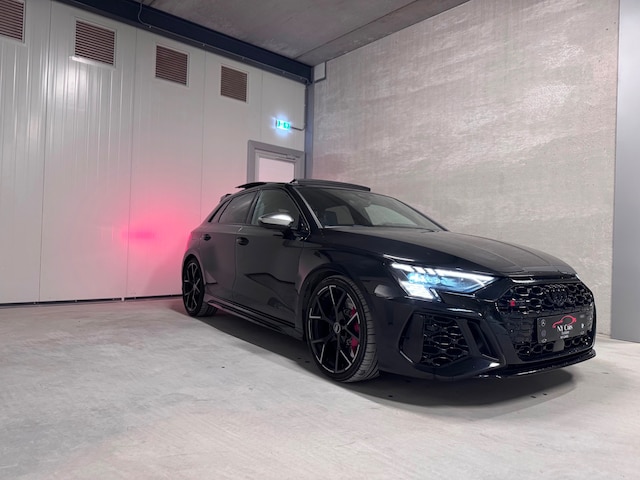 Een schitterende Audi RS3 Sportback uit 2023, uitgevoerd in stijlvol zwart met rode stiksels en een sportieve spoiler. Een auto die prestaties, luxe en uitstraling perfect combineert.