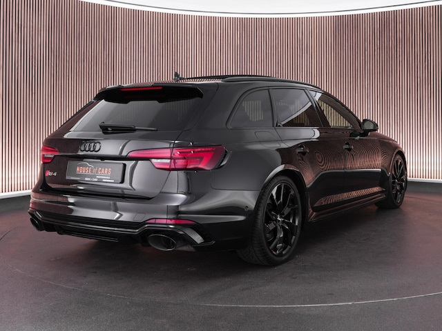 Audi RS4 Avant 2.9 TFSI quattro uit 2019 in Mythoszwart metallic. Een auto die alles in huis heeft: de ruimte en bruikbaarheid van een Avant, gecombineerd met het karakter en de prestaties die je van een echte RS verwacht. Dankzij de 2.9 biturbo V6, quattro-aandrijving en tiptronic automaat is dit een auto die onder alle omstandigheden indruk maakt, maar tegelijk ook comfortabel genoeg is voor dagelijks gebruik.