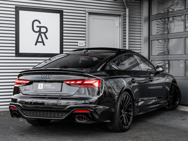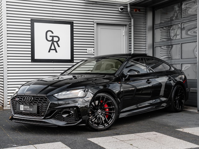 Een zéér complete Audi RS5 Sportback uit oktober 2022. Deze RS5 Sportback is full black uitgevoerd in het Mythoszwart metallic gecombineerd met zwarte sierlijsten, zwarte logo's vóór en achter en zwarte type aanduiding, dit afgemaakt met 20 inch lichtmetaal. In het interieur is de auto voorzien van zwart lederen bekleding met een rood contrasterende stiksel RS embleem en ene honingraad motief. Verder is deze RS5 o.a. uitgevoerd met Head-up display, B&O Soundsysteem, originele 20 inch Audi Sport GMBH velgen en massage voor de voorstoelen.