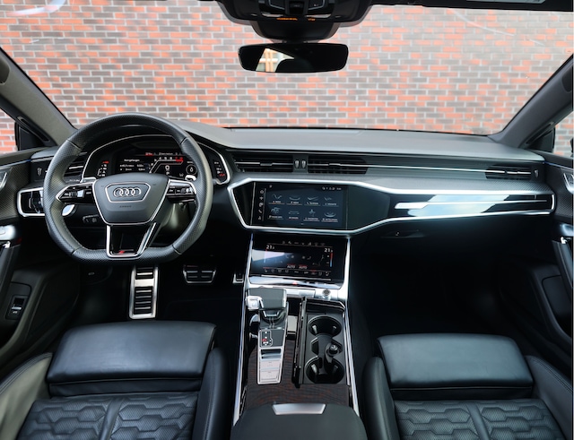 Het zwart lederen interieur is eveneens fraai, met de carbon lijsten, lederen dashboard en panoramadak. Daarnaast is de Audi ook onderscheidend in opties: Soft-Close, Matrix lampen, Bang&Olufsen, 360 camera, head-up display en de assistentiepakketten “Stad” en “Tour”