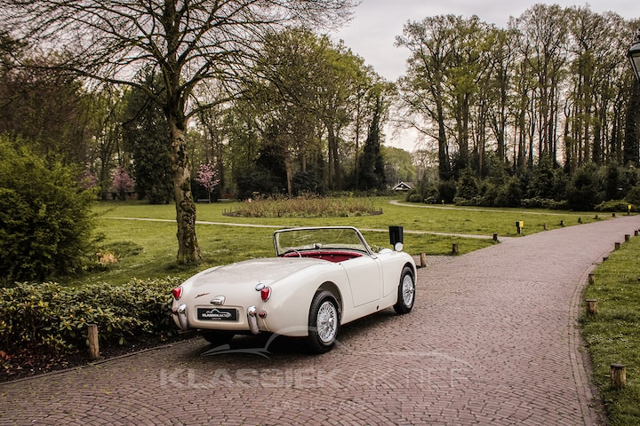 Deze Austin Healey Sprite MKI is in 1960 geproduceerd en oorspronkelijk geleverd in de Verenigde Staten. In 1997 is de auto naar Nederland gekomen (transportbon aanwezig) en heeft vervolgens een grondige en zeer vakkundige body-off restauratie ondergaan. Het resultaat is een werkelijk in nieuwstaat verkerende Austin Healey Frogey in smetteloze conditie en met een prachtige kleurencombinatie Old English White met rood lederen interieur. Zelden hebben we een klassieke auto gezien die zo perfect is gerestaureerd. Uiteraard zijn tijdens de restauratie ook het motorblok en de versnellingsbank volledig gereviseerd.