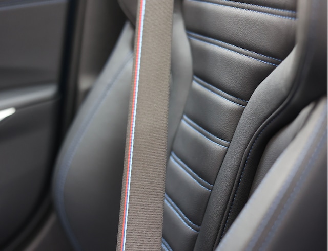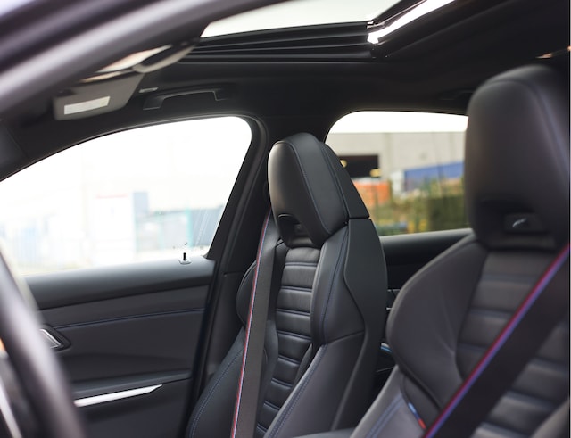 In het interieur vinden we elektrisch verstelbare stoelen met memory en verwarming. Voor een extra luxe gevoel is het dashboard eveneens bekleed met leder en is alles versierd met blauwe contrasterende stiksels. Om meer licht in het zwarte interieur te brengen is er een glazen schuif-/kanteldak aanwezig.