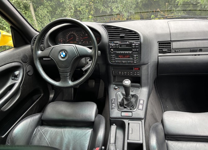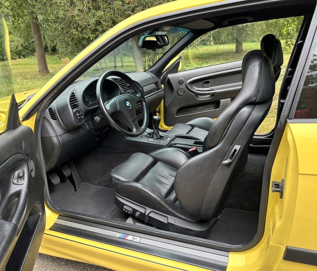 De buitenzijde is zeer strak, schadevrij en alle naadjes zijn correct. De auto is uitvoerig gepolijst en gepoetst en de lak is super glad. De body staat voor 90% in de originele lak. Dakargelb is de M3 introductiekleur, dus deze kleur heeft toen in alle autobladen gestaan. Sowieso zijn er maar een paar "echte" E36 M3 kleuren en dat zijn Dakargelb en Estorilblau. Dat zijn nu de geliefde en gezochte kleuren. De originele M3 velgen zien er uit als nieuw en zijn voorzien van de correcte Michelin Pilote Sport banden. Op de buitenspiegels zitten nog de originele stickertjes uit de fabriek!