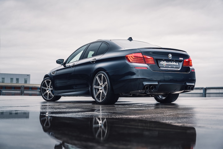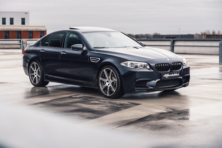 Een BMW M5 van 10 jaar oud met net 110.000km die eruitziet alsof er nauwelijks mee is gereden. Je gelooft het bijna niet als je de kilometerstand ziet. Geen krasje op de instaplijsten of portierbakken, nauwelijks steenslag waarneembaar, een minimaal aangestipt krasje bij het kofferdeksel, bekleding als nieuw, motorruimte smetteloos, echt een onvoorstelbaar mooi verzorgde auto. Het lijkt wel of de eigenaar alleen op zijn sokken in de auto is gestapt en vervolgens de kilometers op de rollenbank heeft gemaakt. Ooit begon het met de snelste sedan die er te koop was. De BMW E28 M5 begon met een dikke motor met 286 pk uit de M1, wat subtiele carrosseriewijzigingen en een aangepaste ophanging. Opgevolgd door de E34 met uiteindelijk een 3,8 liter met 340 pk die zelfs als touring leverbaar was. De derde generatie deed er natuurlijk nog een schepje bovenop met een dikke V8 van 5 liter en 400pk. Uiteindelijk kwam er nog de über M5 met 5 liter V10 en SMG transmissie in de E60 serie. Bij de F10 ging het qua inhoud en cilinders naar een maatje minder, maar wel met veel meer vermogen en koppel. Mede gedwongen door de emissie-eisen werd de 4,4 liter V8 voorzien van 2 turbo’s en leverde de motor 560pk en 680NM koppel. Uiteindelijk is de 5e generatie F90 in 2017 op het toneel verschenen die werd opgevolgd door de huidige Hybride versie. De door ons aangeboden M5 is de F10 die t/m 2017 werd gebouwd en voorzien van het Competition Package, goed voor 575pk. Naast meer vermogen omvat het pakket ook een straffere afstelling van de (10mm kortere) veren en schokdempers, een dikkere stabilisatorstang, veranderingen aan de vooras en een aangepast M-differentieel. Optisch werd de M5 voorzien van Dark Chrome eindpijpen en speciale 20” velgen (styling M601).