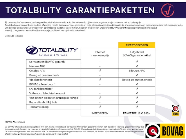 Bij Totalbility stapt u in met zekerheid. Daarom leveren wij de meeste auto’s standaard met 6 maanden BOVAG-garantie, zonder bijkomende kosten. In enkele gevallen kan hiervan worden afgeweken, bijvoorbeeld bij oldtimers, youngtimers of om andere specifieke redenen. Zo weet u zeker dat u rijdt met kwaliteit, betrouwbaarheid en uitstekende service, volledig volgens de strenge eisen van de BOVAG.