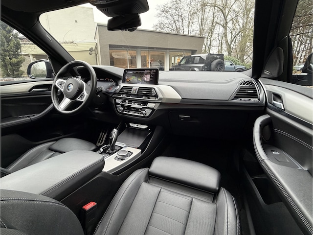 Deze BMW X3 M40d xDrive is uitgevoerd in carbon-schwarz en voorzien van het Black Design Pack waarbij de grille, de velgen en alle sierdelen in hoogglans zwart zijn afgewerkt. De auto beschikt over Blacklook koplampbehuizingen en achterlichten met getint glas wat zorgt voor een uniforme en krachtige uitstraling. Het panoramadak en de 21 inch V-spaakwielen in hoogglans zwart maken het exterieur volledig.