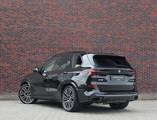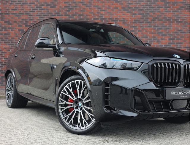 De BMW X5 50e mét het M Sport Pro pakket, wat hem net een sportievere en scherpere uitstraling geeft. Dit pakket accentueert perfect op de Black Sapphire Metallic lak met de brute 22 inch lichtmetalen velgen, met daaronder de rode M sport remmen.
