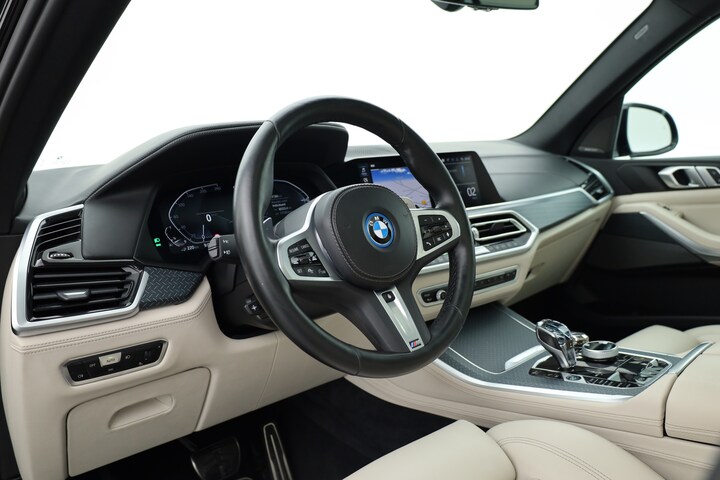 BMW X5 xDrive45e M Sport voorzien van o.a. panoramadak, head-up display, stoel en stuurverwarming, achterbank verwarmd, luchtvering, achterbank verwarmd, laser led koplampen, luchtvering, Apple CarPlay en Android Auto, lederen bekleding etc.