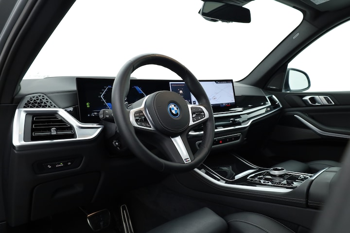 Binnenin tref je het luxe lederen Merino Schwarz interieur, dat het exclusieve karakter van deze X5 perfect weerspiegelt. Beide voorstoelen zijn voorzien van stoelventilatie, wat het comfort in alle seizoenen optimaliseert. De Harman Kardon audio-installatie, het panoramadak en de 360° camera versterken het premium karakter, terwijl de adaptieve cruise control en elektrische trekhaak de X5 extra praktisch en gebruiksvriendelijk maken.