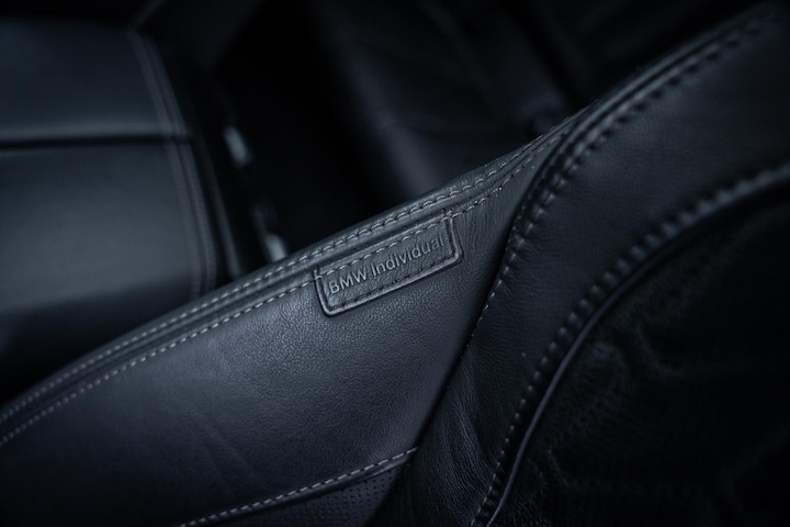Zijn overtuigende voorkomen komt onder andere door de combinatie van de kleurcombinatie zwart-zwart, op het exterieur vinden we de welbekende prachtige BMW Individual kleur terug namelijk: Sapphire Schwarz gecombineerd met het Shadow-pakket. Als we de deuren openslaan zien we het dikke Individual Merino lederen interieur afgewerkt met geruite stiksels, heel gaaf! Oja, vergeet de Crytallen elementen niet zoals de pookknop en draaischijf voor het multimediasysteem, heel classy.