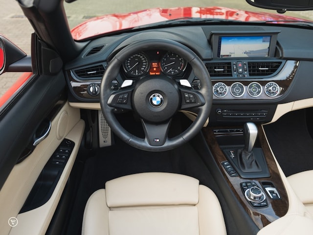 Melbournerood is een helaas weinig, maar zeker op deze tweede generatie Z4 zeer graag geziene gast in onze showroom. Al is het maar omdat deze prachtige rood metallic Sportwagen-kleur uitsluitend besteld kon worden in combinatie met de M-sportuitvoering. De scherper gesneden bumpers, maatje grotere wielen, Sportstoelen en het M-stuur + de zwarte hemelbekleding zijn hier dus ook present.