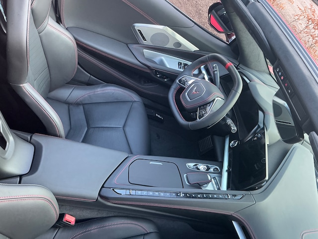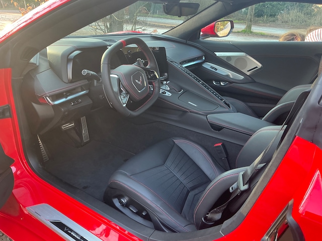 Te koop aangeboden: een unieke Corvette C8 Stingray 3LT met Z51 Performance Package, uitgevoerd in de iconische kleur Torch Red met een Jet Black interieur en Adrenaline Red custom stitch.