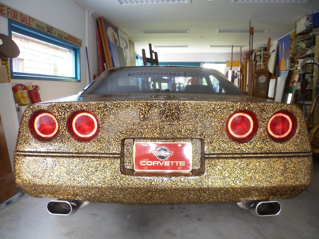 Beschilderde Chevrolet Corvette in 2 kleuren goudverf met blanke lak.