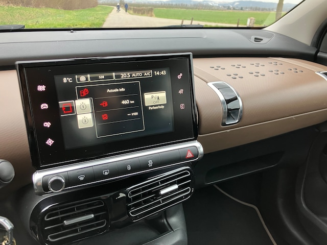 Het C4 Cactus concep is basic, maar de auto is toch erg compleet met een fijne airconditioning en navigatiesysteem. Verder heeft de auto een mooi panoramisch dak, wat de auto lekker licht maakt. De bekleding is zwart/bruin gecombineerd met het mooie lichtbruine dashboard.