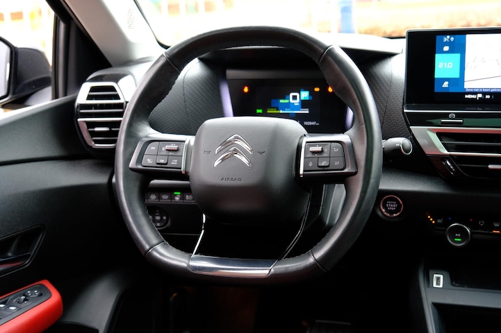 Wat ook opvalt, is de strakke en overzichtelijke informatie die het digitale dashboard levert. Dankzij de 360 graden camera op de auto, wordt manoeuvreren in smalle straatjes ineens veel eenvoudiger. Adaptive cruise control houdt de ingestelde snelheid vast en houdt afstand tot het voertuig voor u. Communiceren met uw auto? Dat gaat via remote services. Met uw smartphone maakt u waar dan ook contact om allerlei functies te checken of te activeren. Kies de muziek waarvan u houdt, dankzij de DAB-radio klinkt het altijd geweldig. Intussen bedient u het audio-installatiesysteem en het navigatiesysteem met de knoppen op het stuur of met uw stem. Ook is de Citroen uitgerust met: achteropkomend verkeer waarschuwing, automatische airconditioning, regensensor, keyless entry en automatisch dimmende binnenspiegel.