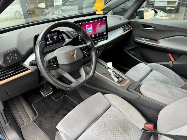 Elektrisch vermogen of onderscheidend vermogen? De CUPRA Born heeft het allebei in overvloed. Met de elektromotor zoeft u fluisterzacht over de weg. Een krachtige motor geeft deze auto zijn sportieve prestaties. Lang onderweg zijn kan een behoorlijke uitdaging zijn voor rug en schouders. Daarom zijn de verwarmbare voorstoelen voorzien van een weldadige massagefunctie. Pittig rijden wordt nog comfortabeler dankzij de fraaie sportstoelen. Bij de uitrusting van deze auto horen onder meer 19 inch lichtmetalen velgen, Full LED koplampen, sportonderstel, donker getint glas achter, in delen neerklapbare achterbank en LED-achterlichten. Het digitale dashboard vertelt u alles wat u wilt weten voor een slimme, comfortabele en veilige rit. De achteruitrijcamera levert eersteklas parkeerservice. U weet precies hoeveel ruimte u nog heeft, in beeld en geluid. Als u de adaptive cruise control inschakelt, regelt de auto zelf de snelheid en de afstand tot de auto voor u. Ingebouwde spraakbediening maakt het mogelijk om de auto te bedienen zonder dat uw aandacht wordt afgeleid. Met uw smartphone maakt u overal contact met de auto. Remote services geven direct inzicht in uiteenlopende functies en zijn op afstand te activeren. En dan is deze auto ook nog eens voorzien van full map navigatiesysteem, automatische airconditioning, draadloos opladen, DAB ontvangst, regensensor en sportstuurwiel.