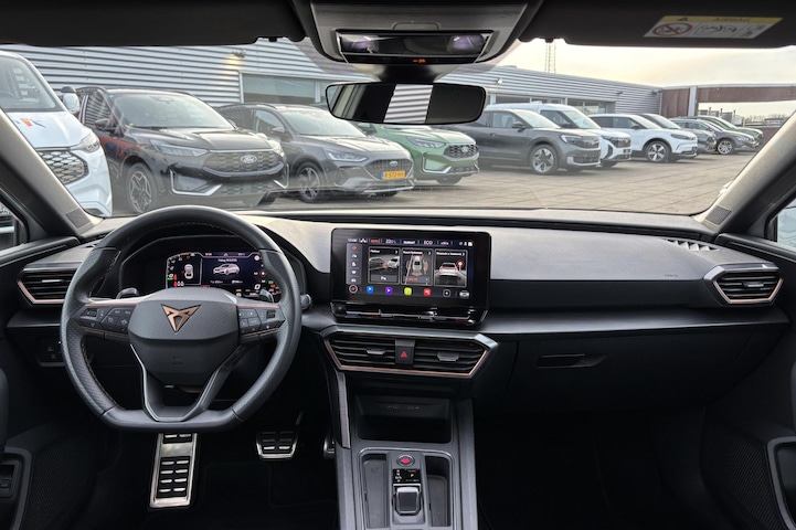 Alle benodigde informatie helder in beeld: het digitale dashboard is een geweldige rijhulp. Als je de adaptive cruise control inschakelt, regelt de auto zelf de snelheid en de afstand tot de auto voor je. Ingebouwde spraakbediening maakt het mogelijk om de auto te bedienen zonder dat jouw aandacht wordt afgeleid. Oliepeil, bandenspanning, sloten en andere functies zijn via een speciale app overal te checken dankzij Connected Services. Nooit meer de weg kwijt: daarvoor zorgt het onboard full map navigatiesysteem. Je bent in deze CUPRA ook voorzien van electronic climate control, DAB ontvangst, parkeersensoren achter, regensensor, keyless entry en automatisch dimmende binnenspiegel.
