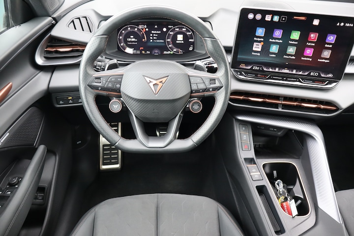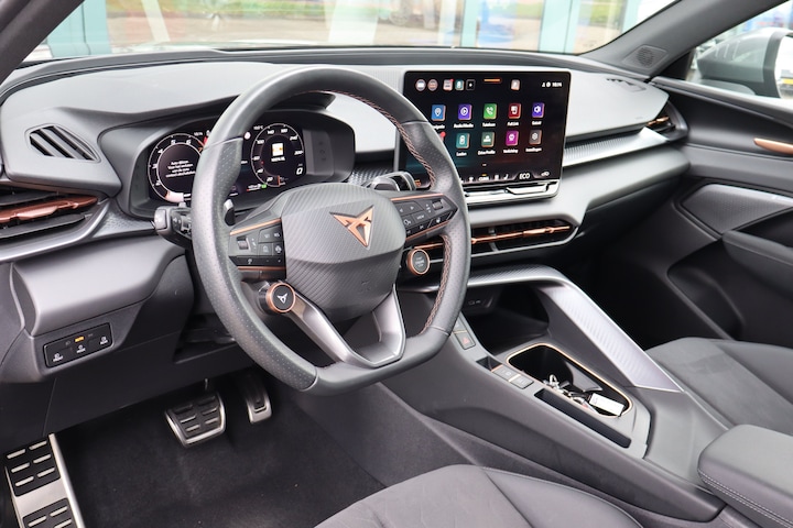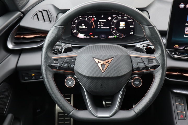 Deze goed onderhouden CUPRA Terramar heeft nog maar weinig op de teller staan. Een jonkie voor een oude prijs! Elektrisch rijden of benzine? Deze hybride CUPRA Terramar combineert de pluspunten van allebei naar keuze. 's Winters komen de verwarmbare voorstoelen heerlijk van pas. Het interieur lijkt groter en ruimtelijker dankzij het elektrisch bedienbare glazen panoramadak. De elektrisch bedienbare achterklep opent met een druk op de knop. Ook in winterse omstandigheden is rijden een plezier, niet in de laatste plaats dankzij het verwarmd stuurwiel. Daglicht bij nacht? De koplampen met matrix LED-verlichting zorgen ervoor. Ook is de auto voorzien van: 20 inch lichtmetalen velgen, adaptief dempingsysteem, trailer assistent, extra getint glas, in delen neerklapbare achterbank en LED-achterlichten. Voor een goed en duidelijk overzicht onderweg is het digitale dashboard uitermate slim ingedeeld. De kracht van de 360 graden camera op deze auto resulteert in optimale zichtbaarheid en veiligheid. Adaptive cruise control is een comfortabele en veilige optie. Het systeem reguleert de snelheid en houdt automatisch afstand tot uw voorligger. Spraaksturing luistert naar uw stem en bedient de belangrijkste voertuigfuncties. Deze CUPRA Terramar is voorzien van een elektrisch inklapbare trekhaak voor als u met een caravan of aanhanger op pad wilt. Extra opties op deze auto zijn: connected drive services, premium audiosysteem, navigatiesysteem, automatische airconditioning, draadloos opladen en DAB ontvangst. Met de nieuwste technologieën aan boord is deze CUPRA in staat om zelf te reageren op potentieel gevaarlijke situaties op de weg. Da's veilig! Alle informatie geprojecteerd op de voorruit via head-up display, zodat u uw ogen op de weg kunt houden! Onderweg fungeert de verkeersbord-detectie als het ware als uw bijrijder en attendeert u op de verkeersborden langs de weg. Met het Lane-keeping systeem komt u nooit per ongeluk buiten de rijstrook. U bent mede dankzij dodehoekdetectie, forward collision warning system, hill hold functie, vermoeidheidsherkenning, frontale botsbescherming en bandenspanningcontrolesysteem steeds veilig onderweg. Er is nog meer te vertellen over deze auto, maar dan moet u hem ook zelf ervaren. U bent van harte welkom om hem te bekijken en om een proefrit te maken.